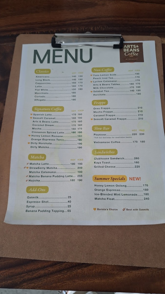 The menu at Arts and Beans is a treasure trove for coffee lovers. Start your journey with their classics, such as the Double Shot Espresso or the delightfully creamy Hot Milk, both priced at ₱215.00. For something more invigorating, dive into their signature offerings: the Orange Espresso—a refreshing concoction of shaken orange juice, cinnamon, and nutmeg for just ₱240.00—or try the Dirty Horchata, a decadent blend of steeped Jasmine rice milk, cinnamon, and espresso for ₱250.00.